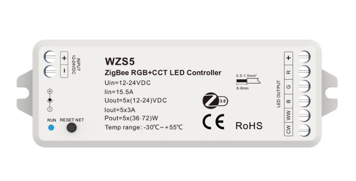 This ZigBee 3.0 LED constant voltage controller is tailored for modern lighting needs. It seamlessly connects to low-voltage RGB+CCT LED strips, offering smooth, flicker-free dimming. This allows users to easily adjust brightness to create the ideal lighting atmosphere for any space