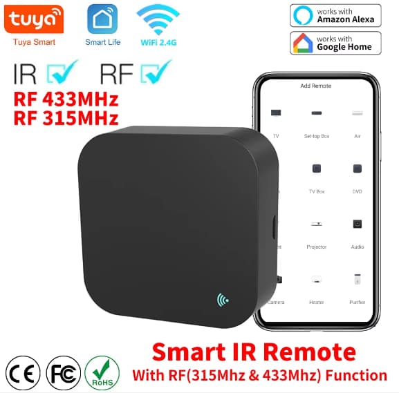 The Smart IR Remote expanded IR code library covers above 98% of IR devices. So TVs, Air conditioners, STB Fan and lighting, etc. which use IR Control can be controlled by it. And RF-enabled devices like curtains, roller shutters, garage doors, RF switches can be controlled by it.